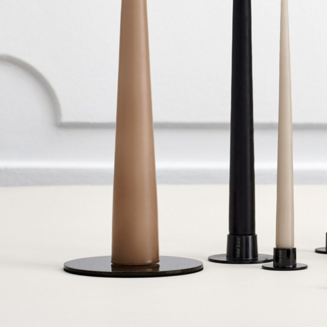 These round plates are simply and stylishly designed, and go very well with our cone candles. The candle is held in place by three spikes, so that all candles sit securely. Grab any cone, pillar, or totem candle, impale it with the spikes, and enjoy.
