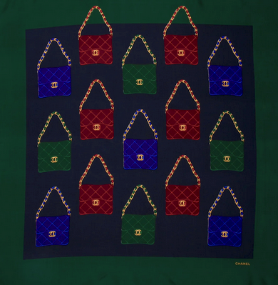 Iconic Vintage Chanel Scarf showing a collection of classic flap Chanel handbags in jewel tones. A must have for the Chanel collector.
