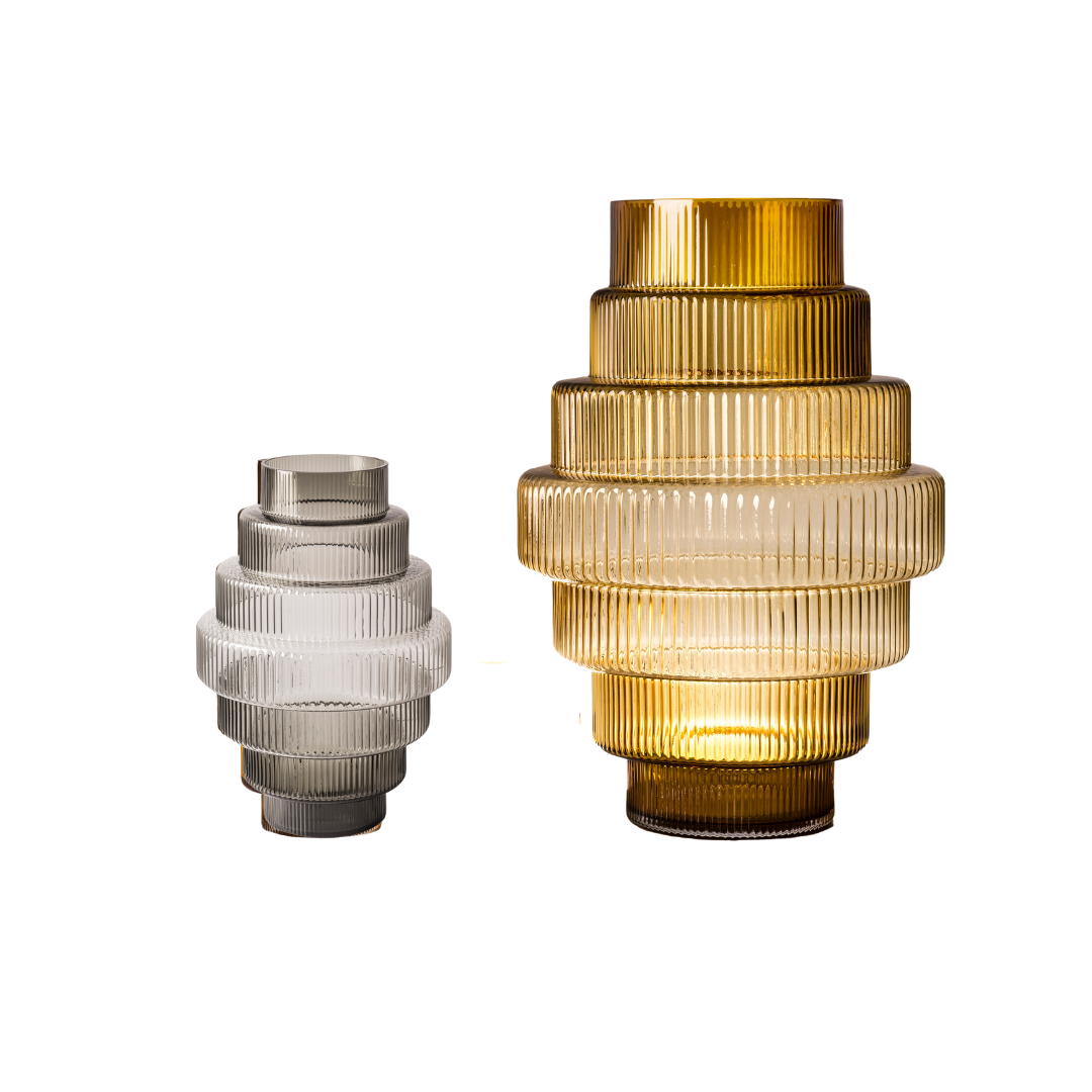 This exquisite vase is crafted from mouth-blown glass. The glass's amber tone compliments the bold geometric pattern to make a modern statement.