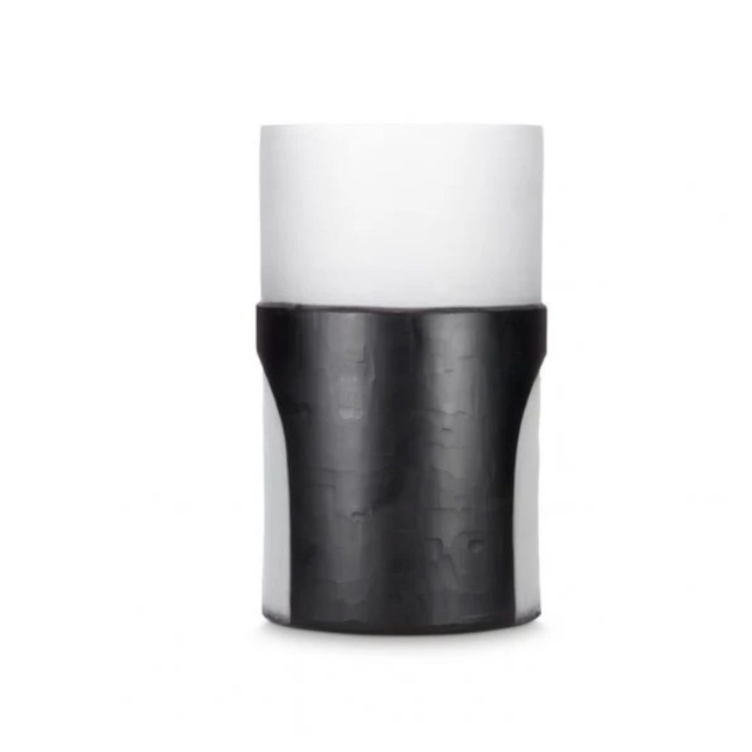This geometric vase is made of double layered, mouth-blown glass that has been acutely cut back to define a series of circular motifs. A Robert Motherwell painting in vase-form, this vase is a sculptural piece of art.