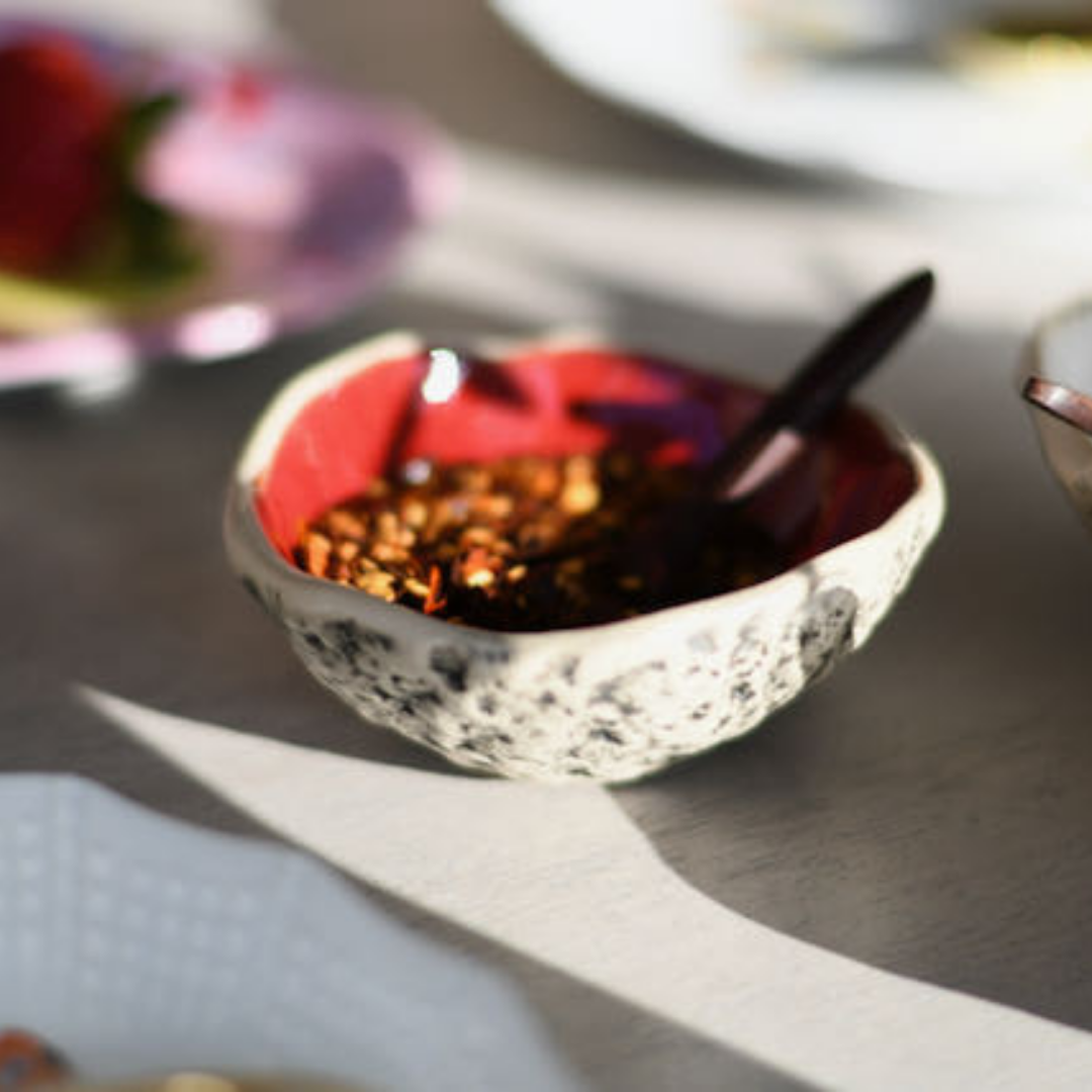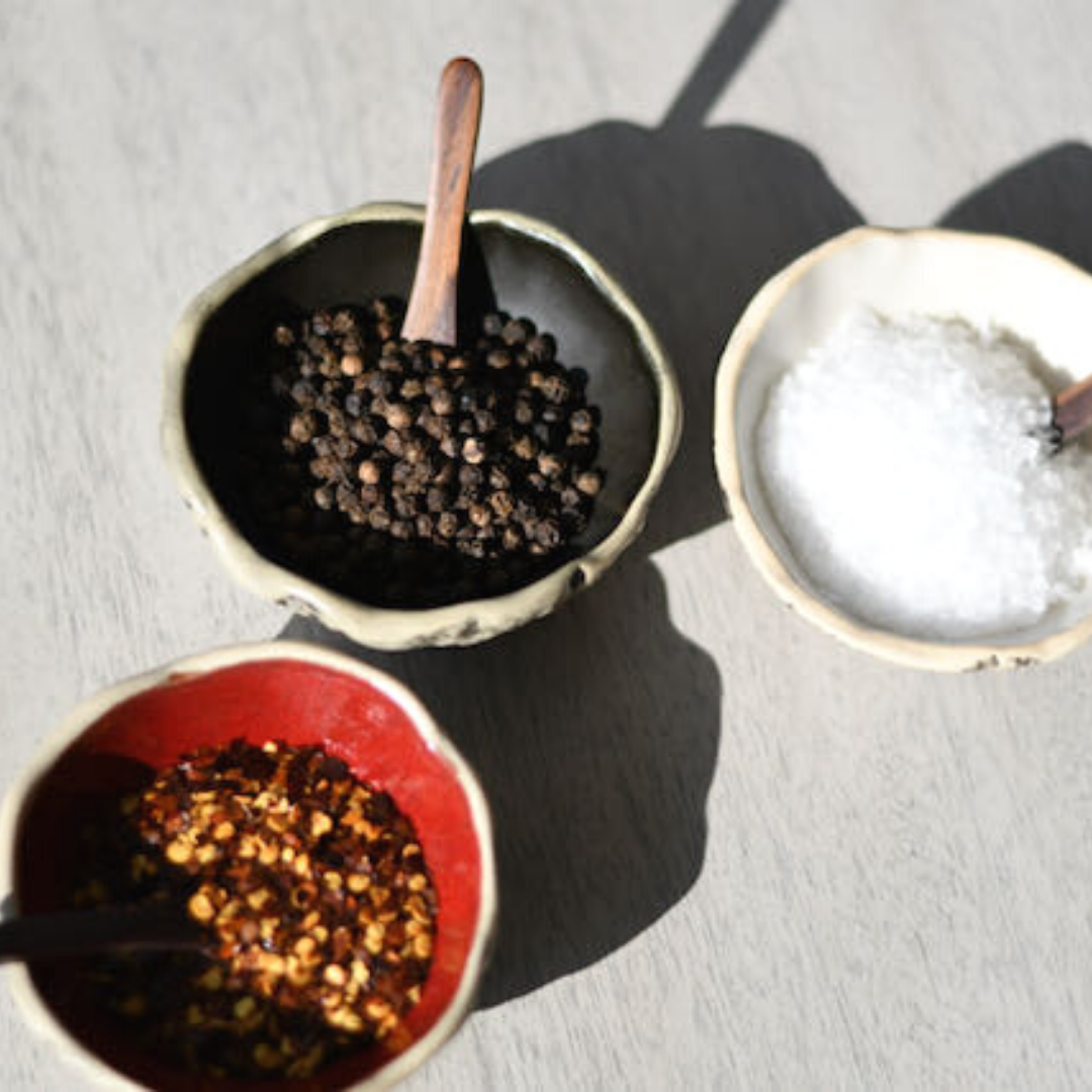 Each one of these bowls are handmade by woman-owned ceramics studio in the Netherlands. The trio of bowls is ideal for salt, pepper, and that little bit of *spice* that every dish needs. They can also be used for jams, sauces, and other toppings.